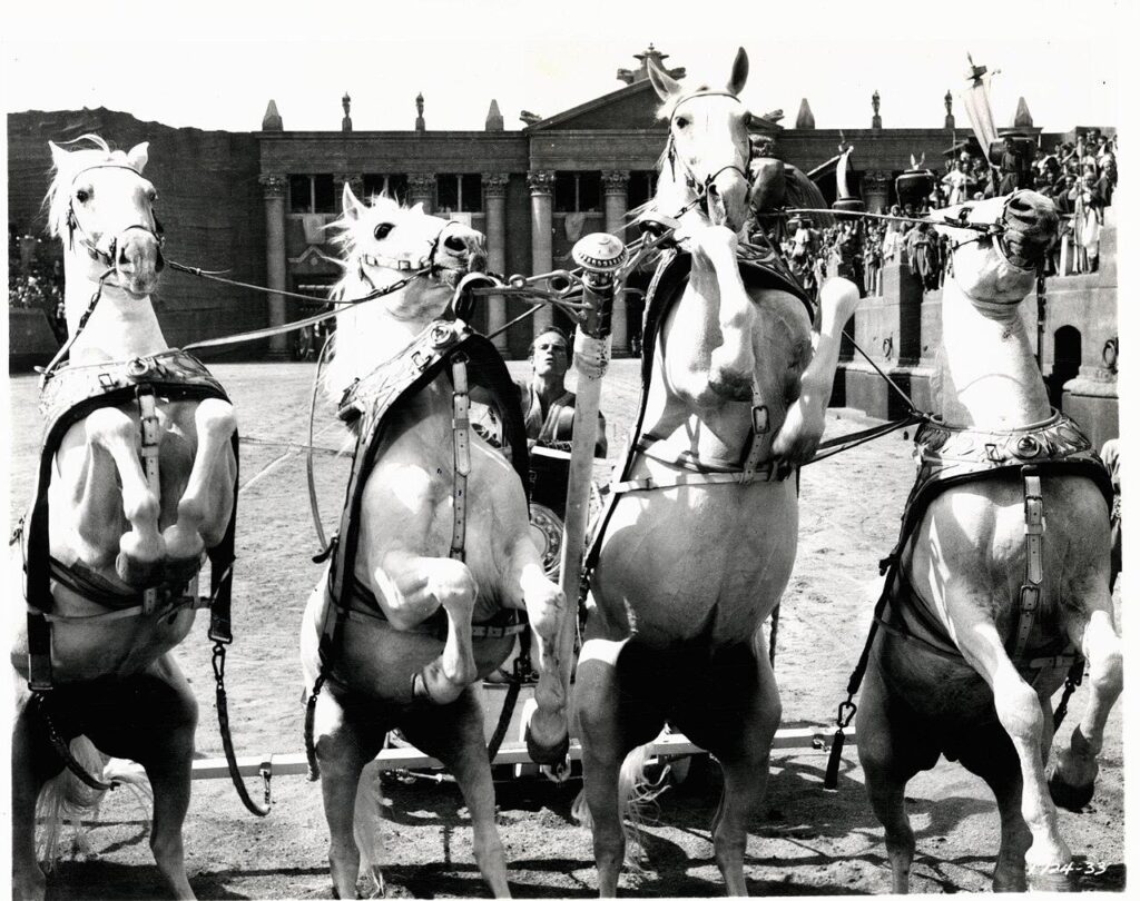 La trama de la película culmina con la carrera de cuadrigas, escena que no rodó el propio Wyler, sino los directores de la segunda unidad Andrew Marton y Yakima Canutt,15 dos especialistas del Western. Cinco semanas de rodaje para once minutos de película. No vamos a referirnos ahora al gran despliegue de medios que utilizó la Metro-Goldwyn-Mayer (construcción del circo a tamaño natural, un año de preparación de hasta el más mínimo detalle, seis mil extras, etc.), aunque era lógico que así lo hiciera, ya que esa era la secuencia clave que salvaría toda la película y más aún, a la compañía misma, que empezaba a mostrar síntomas de crisis. A pesar de todo, el productor Sam Zimbalist murió durante el rodaje de Ben-Hur a causa de un infarto.